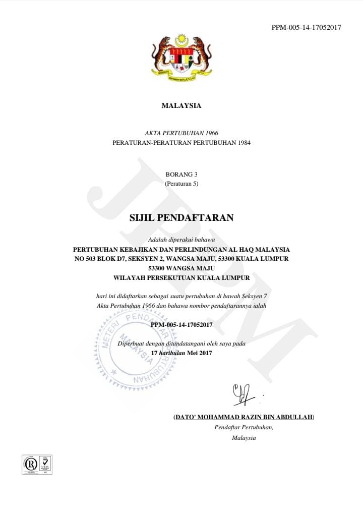 Premis Pertubuhan Kebajikan Dan Perlindungan Al Haq Malaysia ini terletak di No 4, Lorong Pawang, Kampung Datuk Keramat, 54000 Kuala Lumpur.